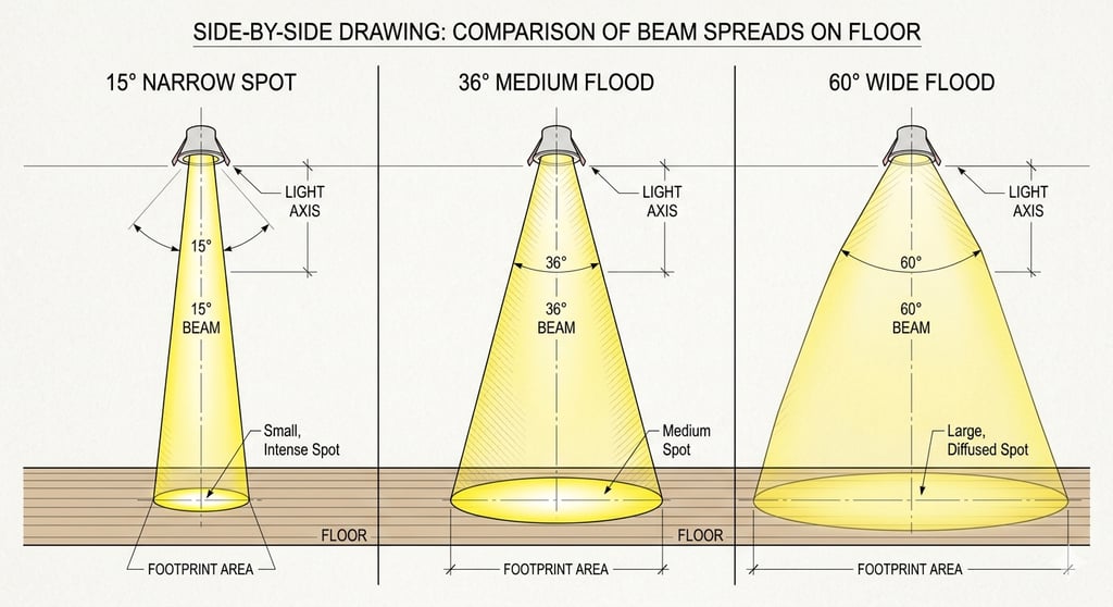 The Effect: It provides a comfortable pool of light that is wide enough to be functional but tight enough to keep the ceiling looking "quiet" and glare-free.
