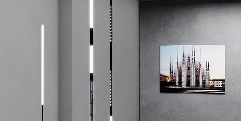 "Invisible" ceiling tracks that allow for flexible placement of spotlights, pendants, and linear washes without rewiring.